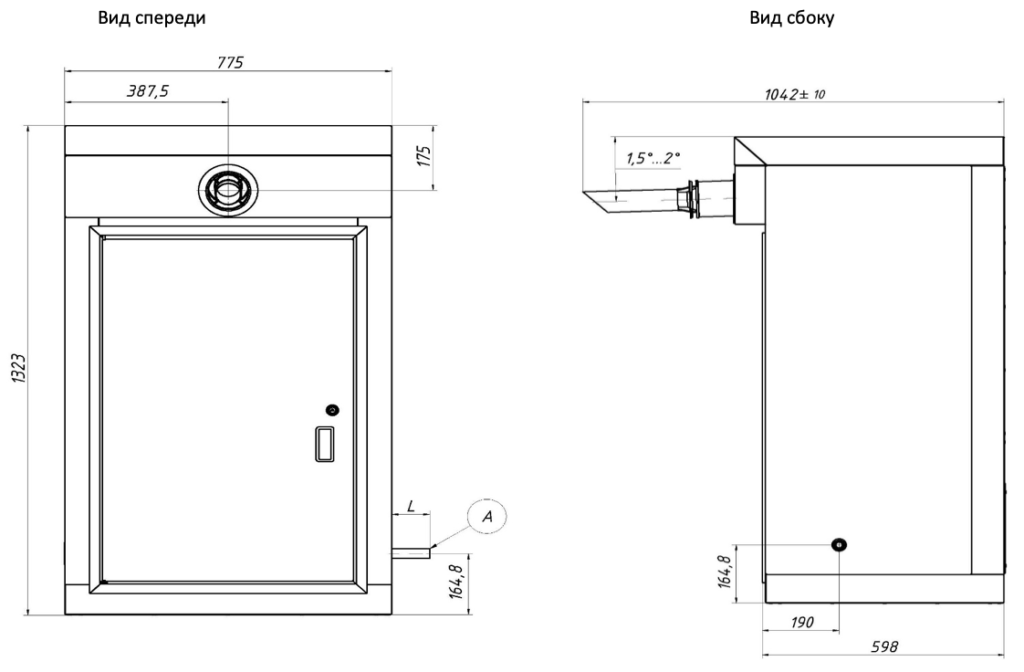 габаритные размеры ТГУ-НОРД-С котел наружного размещения вид спереди и сбоку