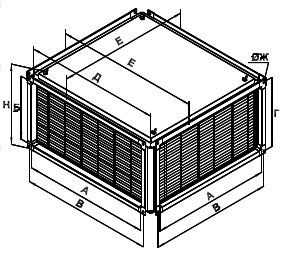 - Корпус из оцинкованного стального листа, оснащённый фланцами.